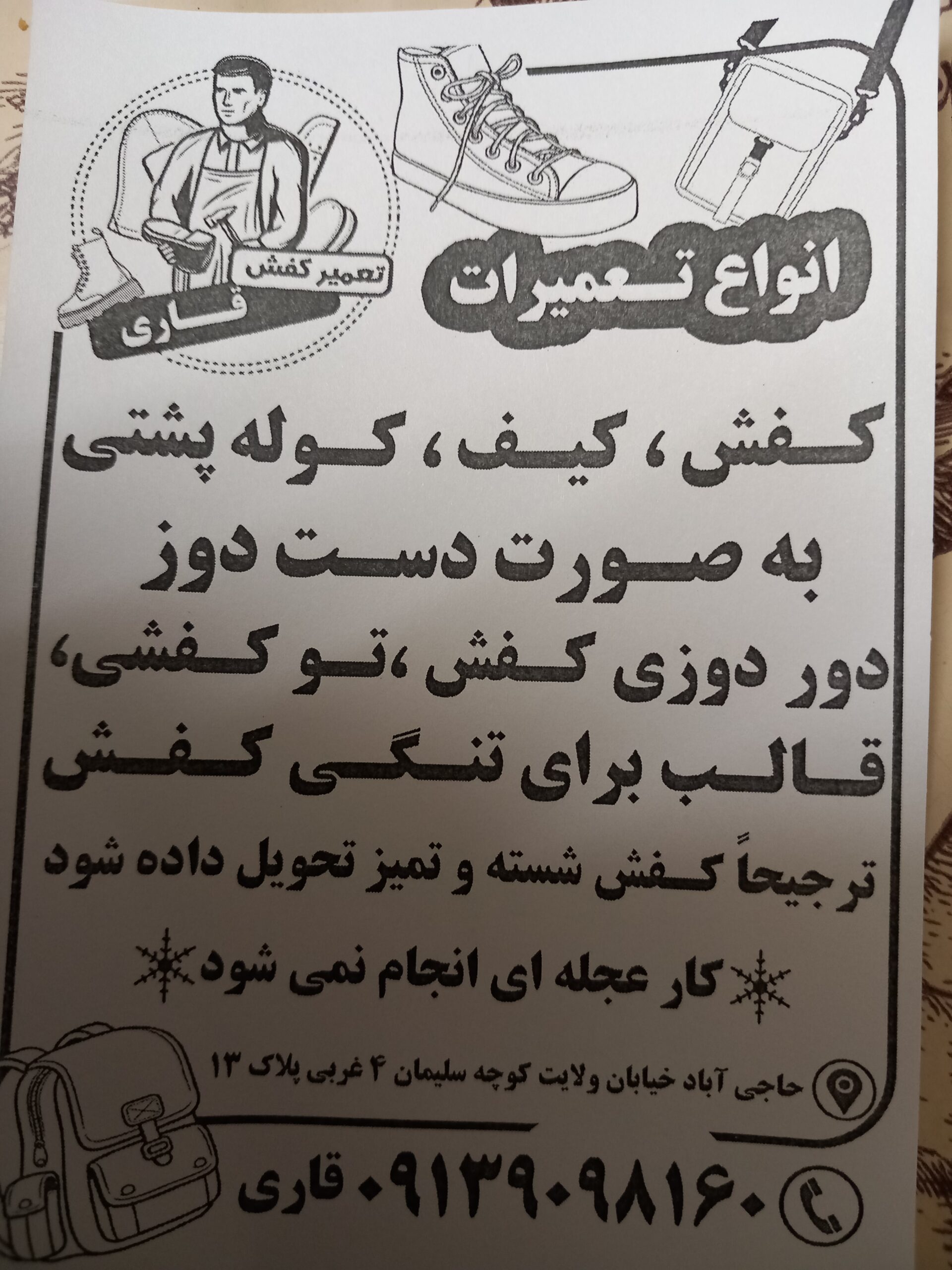خانه » کسب و کار ها » خدمات فنی و تعمیرات » تعمیر کفش و کیف در شاهین شهر